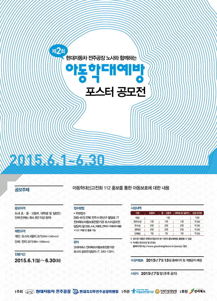 이와 관련, 현대자동차 전주공장과 전라북도, 굿네이버스 전북본부는 오는 30일까지 초?중?고등부, 대학생 및 일반부 등 4개 부문으로 나눠 포스터를 공모한다.